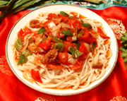 了)。 拉條子用上好面粉和面,拉制而成,呈圓條狀,由此而得名。 在風味小吃中,拉條子是極受各族群眾喜愛的一種。它柔韌細長,圓潤滑爽,吃起來別具風味。做拉條子的關鍵是掌握好和面和拉制兩個環節。和面時用鹽水,鹽要放得適量,恰到好處;和軟一些為宜,揉透餳好。飯館里,都是大把子拉制,技術嫻熟的廚師一把子可拉十幾公斤,只見面團在他手里晃來晃去,瞬間,一把把面團變成宛若銀絲的拉條子,雙臂輕盈,姿勢優美,動作諧調有力,叫人驚嘆稱奇。在一般家庭,則不用大把子拉制法,而是把和面做成30厘米長的小節,涂上清油,蓋上濕布,心靈手巧的回族婦女把面拉得又細又長,有的長達兩米。