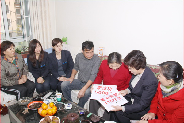 2012年10月17日,盡管季節已進入瑟瑟寒冷的深秋,但新疆華春投資集團的愛心捐款,為患病員工送去了溫情暖意。新疆華春投資集團工會主席高青與人力資源部、集團子公司華景物業及編輯部的管理人員一行,代表新疆華春投資集團李成功總裁和華春全員前去親切慰問患病的員工杜菊萍,當她接過李成功總裁和華春員工16925元的愛心捐款時,流下感動的淚水。杜菊萍的丈夫激動的一再說:“太感謝華春老總和華春人了,對一個基層員工還這樣的關心,太感謝、太感謝了!”