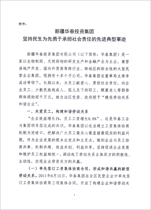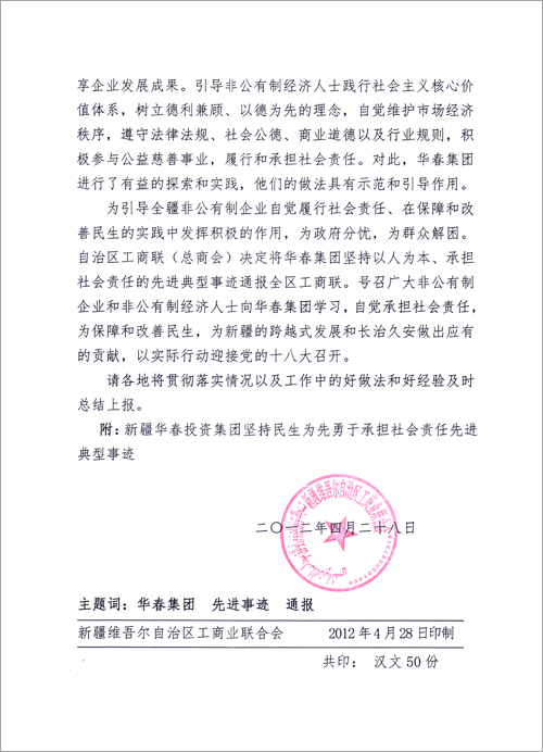 為引導全疆非公有制企業自覺履行社會責任,在保障和改善民生的實踐中發揮積極的作用,為政府分憂,為群眾解困。自治區工商聯(總商會)決定將華春投資集團堅持民生為先勇于承擔社會責任先進典型事跡通報全區工商聯。號召廣大非公有制企業和非公有制經濟人士向華春投資集團學習,自覺承擔社會責任,為保障和改善民生,為新疆的跨越式發展和長治久安做出應有的貢獻,以實際行動迎接黨的十八大召開。