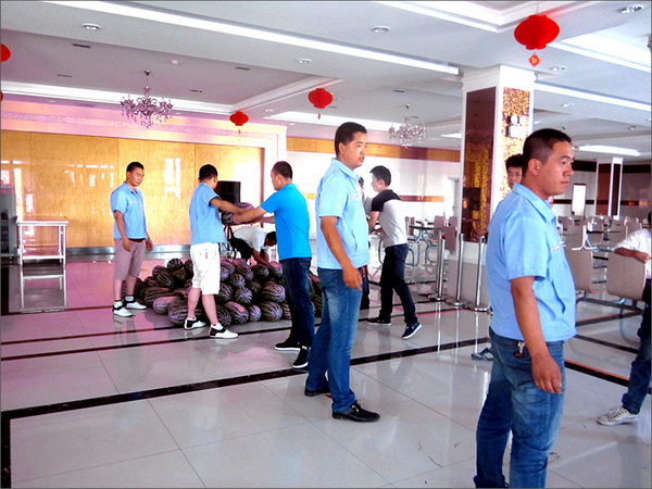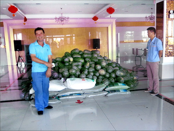 在炎炎暑夏的7月底,五家渠師市工會主席董亮全一行5人,前往行業(yè)龍頭企業(yè)新疆華春毛紡工業(yè)園,為奮戰(zhàn)在大生產(chǎn)一線的各族員工送上關(guān)愛的“清涼大包”——滿滿一車的5000公斤西瓜、400公斤綠豆、100公斤白砂糖等防暑降溫品。