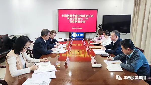 新疆華春生物藥業股份有限公司李成功董事長與華春藥業相關技術人員一行4人,于1月28日就相關合作事宜與中科院新疆分院、新疆醫科大學進行了洽談。中科院院士中科院新疆分院院長、分黨組成員肖文交、新疆醫科大學黨委副書記校長阿吉艾克拜爾·艾薩及相關部門負責人員參加了洽談。