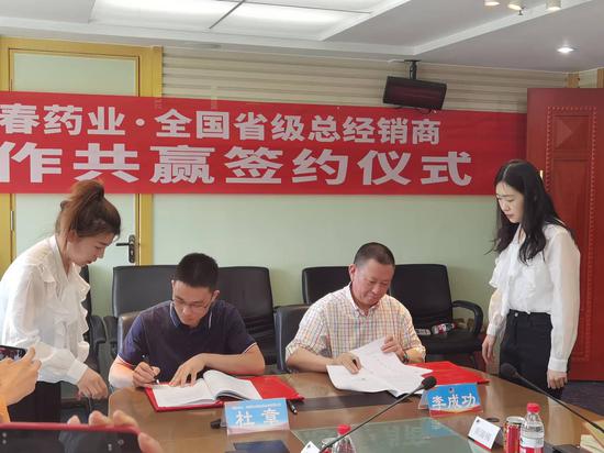 新疆華春投資集團董事局主席兼總裁、華春藥業董事長李成功 ,分別與河南億諾醫療服務有限公司總經理劉磊(河南省代)、西藏林芝百盛藥業有限公司總經理王彥喆(遼寧省代)、湖南藥眾聯信息技術有限公司銷售總監鐘慶成(湖南省代)、山西仁達藥業有限公司董事長徐金木(山西省代)簽訂了《“參葛補腎膠囊”推廣服務協議暨省級總經銷協議》。華春藥業此次與全國4家省級總經銷商簽署合作協議,標志著華春藥業抗抑郁癥1.1類中藥創新藥“參葛補腎膠囊”在全國的營銷布局進入實質性階段。