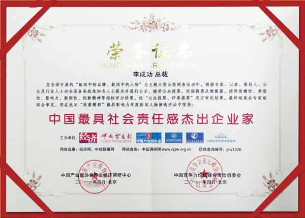 于4月23-24日在北京隆重召開(kāi)的“2011中國(guó)企業(yè)競(jìng)爭(zhēng)力年會(huì)暨誠(chéng)信與發(fā)展高峰會(huì)”上,由中國(guó)產(chǎn)業(yè)經(jīng)濟(jì)調(diào)研中心發(fā)布了《2011中國(guó)最具競(jìng)爭(zhēng)力企業(yè)年度排行》和《中國(guó)經(jīng)濟(jì)最具影響力時(shí)代新聞人物》,新疆華春投資集團(tuán)榮獲“引領(lǐng)中國(guó)民營(yíng)經(jīng)濟(jì)尚佳典范品牌”、總裁李成功榮獲“中國(guó)最具社會(huì)責(zé)任感杰出企業(yè)家”稱號(hào)。
