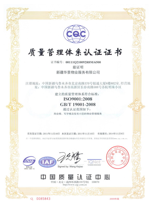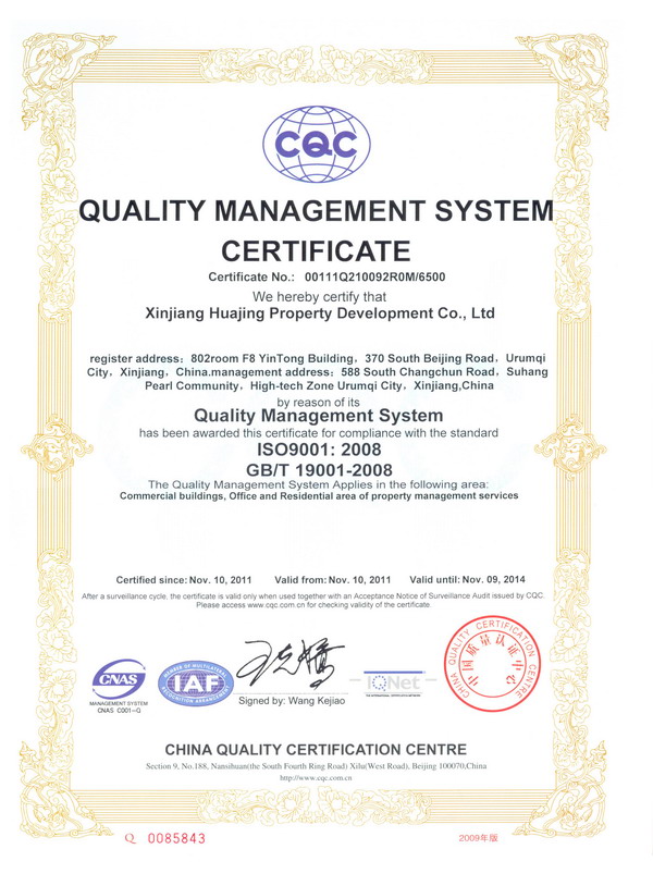為了能夠長期、穩(wěn)定地向業(yè)主提供滿意的服務(wù)和品質(zhì),華景物業(yè)始終堅持以創(chuàng)新科技求發(fā)展,以高質(zhì)量求生存,推行先進(jìn)的管理理念,建立最新的管理質(zhì)量體系作為企業(yè)宗旨,使公司能夠早日與國際質(zhì)量體系接軌。2011年在公司領(lǐng)導(dǎo)的大力倡導(dǎo)下,在各職能部室的全力配合下,由中國檢驗認(rèn)證集團(tuán)新疆有限公司委派的審核組成員一行五人,依據(jù)GB/T19001-2008標(biāo)準(zhǔn)、相關(guān)法律法規(guī)的要求,對華景物業(yè)公司認(rèn)證范圍內(nèi)所涉及的商業(yè)樓、寫字樓和住宅小區(qū)的物業(yè)管理服務(wù)過程進(jìn)行了現(xiàn)場審核,經(jīng)過為期兩天的現(xiàn)場審核,審核組成員對華景物業(yè)ISO9000管理體系建立的有效性和符合性給予了肯定,并與2011年11月10日正式取得了由中國質(zhì)量認(rèn)證中心頒發(fā)的質(zhì)量管理體系認(rèn)證證書。