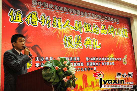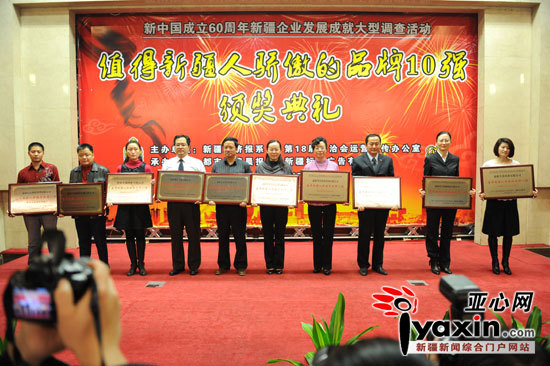 亞心網(wǎng)訊(本網(wǎng)實習(xí)記者 張鈺靈)備受矚目的“新中國成立60周年新疆企業(yè)發(fā)展成就大型調(diào)查活動——值得新疆人驕傲的品牌10強”評選活動,11月7日在烏魯木齊南航國際酒店舉行頒獎典禮,當(dāng)選的十強企業(yè)代表們表示,評選活動讓他們真切地感受到自身品牌的社會影響力,這一榮譽給了企業(yè)莫大的鼓舞,將激勵他們不斷努力,為消費者提供更好的產(chǎn)品和服務(wù)。