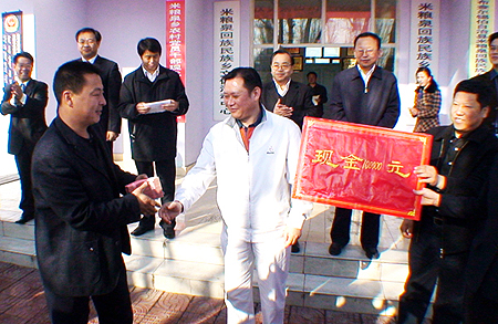 新疆華春投資集團董事局主席兼總裁李成功先生親手將10萬元現金交付于米糧泉鄉領導