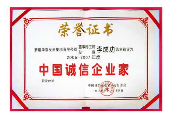 “06-07年度中國誠信企業家”榮譽證書